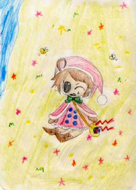 「あわわわわっ〜!いたたたたっ・・・」 勢いよく穴に飛び込んだハマヨシちゃんはしりもちをついてしまいました。 「ここには何があるのかしら?」と周りを見渡すと、そこは春の暖かい風が吹き、きれいな小川の流れる広場でした。 「う〜ん、きもちいいっ♪」 おしりが痛いのも忘れ、ハマヨシちゃんは小川に向かって歩いて行きました。